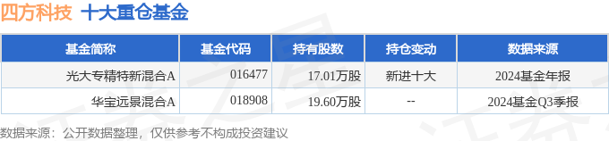 持有四方科技最多的基金为光大专精特新混合A,目前规模为0.31亿元,最新净值0.938(4月23日),较上一交易日上涨7.75%,近一年上涨12.19%。该基金现任基金经理为崔书田。
